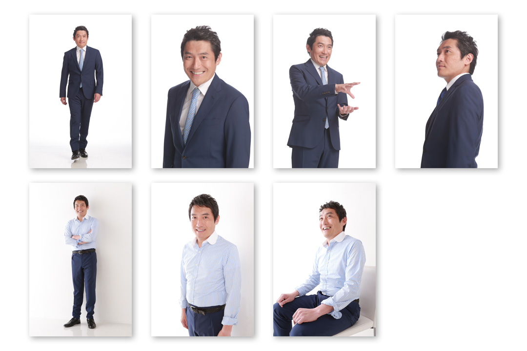 一般的なプロフィール写真の他にアクティブなポーズも含めて撮影、気に入った写真4枚をセレクトしてポスターなどの商業印刷に対応する高画質の画像データをお渡しします。